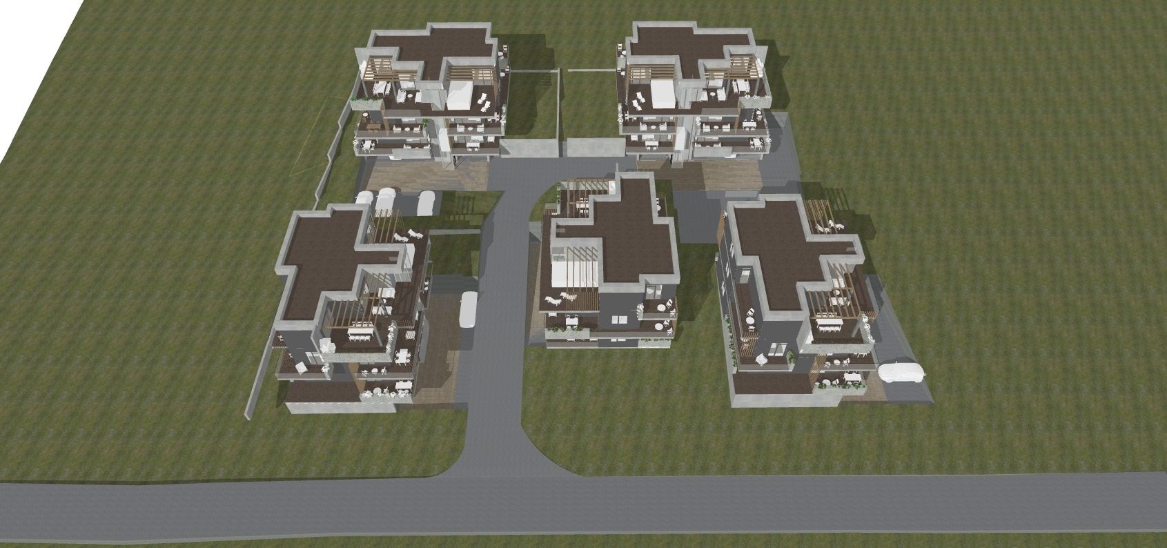 Objekti su energetski razred A. Veličina svakog objekta je 400m2 BRP.-a.Stolarija ALU-antracit.